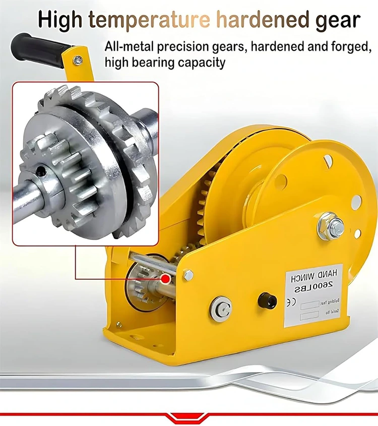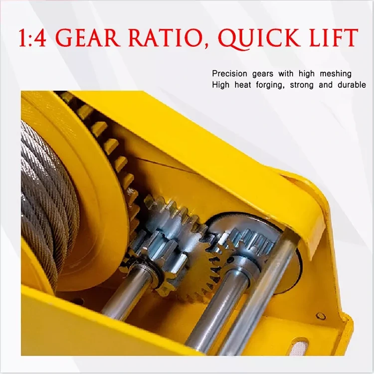 เมื่อคุณเขย่าที่จับ กำลังจะถูกส่งผ่านเกียร์หลายตัว แปลงแรงหมุนเล็กๆ ของคุณให้เป็นแรงบิดขนาดใหญ่บนดรัมเหล็ก จึงบรรลุผล "สี่หรือสองยกหนึ่งพันปอนด์" พูดง่ายๆ ก็คือ คุณใช้ความพยายาม โดยผ่านเครื่องกว้านสามารถส่งออกพลังงานได้หลายครั้งหรือสิบเท่า ซึ่งช่วยประหยัดกำลังคนได้อย่างมาก ปรับปรุงประสิทธิภาพของการจัดการและการลากจูง